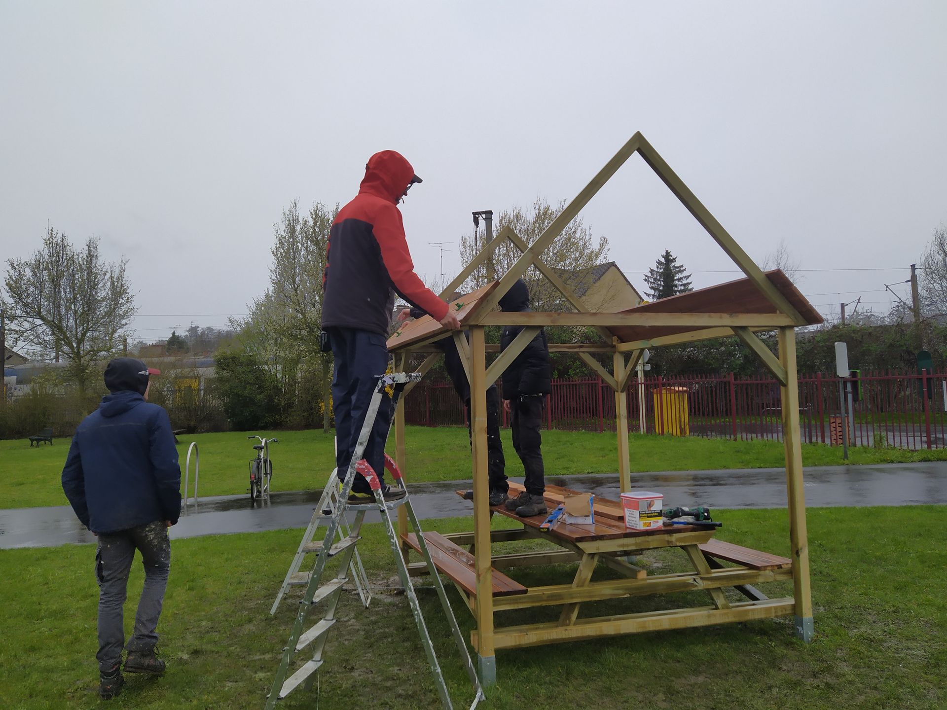 La participation des habitants a été régulière tout au long du chantier, avec un groupe de 7 personnes mobilisées. Les participants ont pu s’impliquer dans les différentes étapes de fabrication : découpe du bois, ponçage, assemblage des structures, ainsi que les premières finitions. Malgré des conditions météorologiques peu favorables, le chantier s’est déroulé dans une bonne dynamique, avec une forte implication des participants.